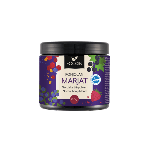 Nordic Bessen Mix van Foodin bevat een grote variatie van de meest populaire biologische en wilde bessen van Finland zoals: blauwe bosbessen, rode bosbessen, aroniabessen, appelbessen, duindoornbessen (sea buckthorn), frambozen, cranberry’s (veenbessen) en zwarte bessen. Deze uitgebreide en voortreffelijke selectie bessen van Nordic Bessen Mix zijn 100% natuurlijk en bevatten geen conserveringsmiddelen.