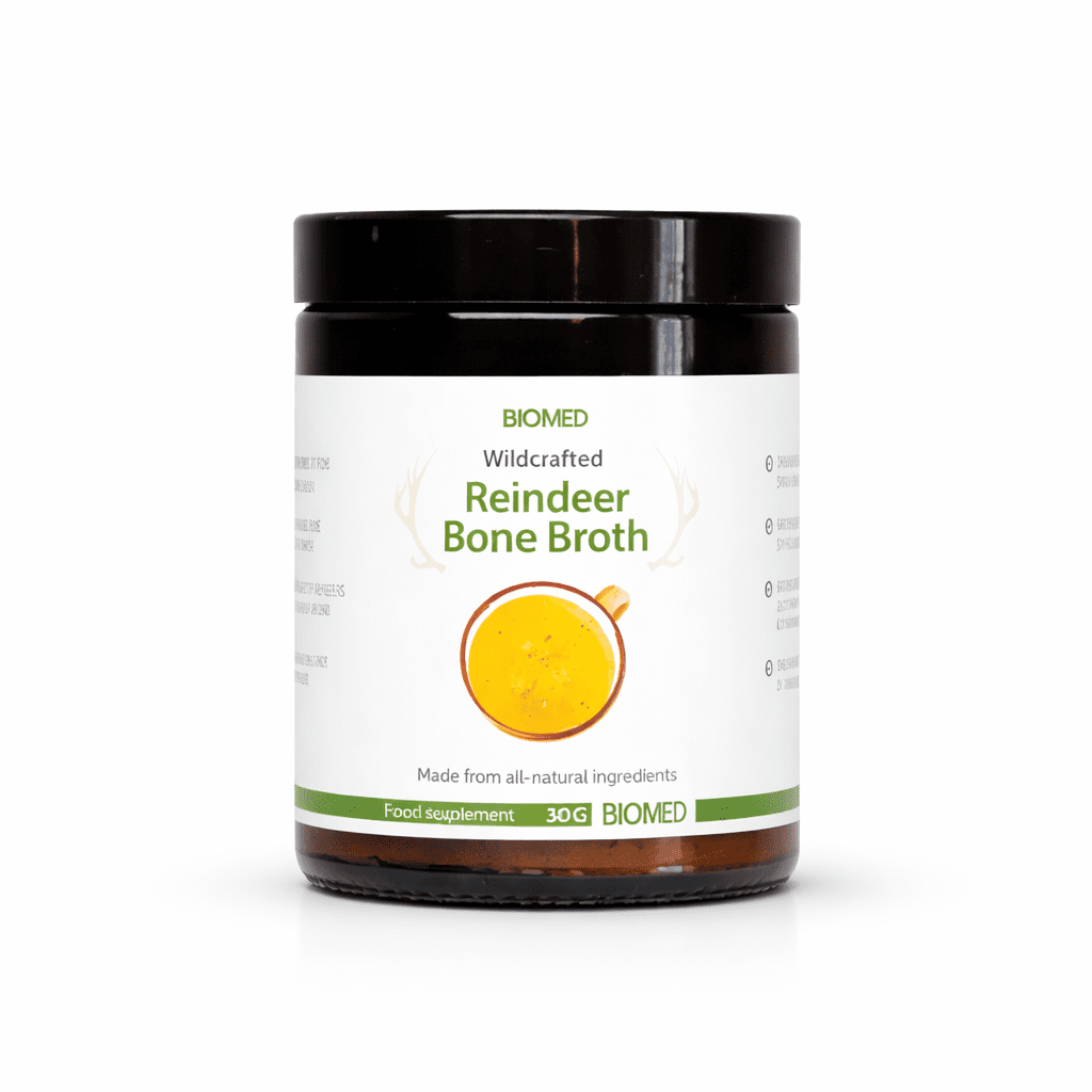 Wildcrafted Reindeer Bone Broth – Rendier Bottenbouillon poeder van Biomed is een natuurlijke en veelzijdige combinatie van meerdere verschillende voedingsstoffen. Door het botmateriaal lang en zacht te brouwen verzacht het, maakt collageen vrij en verteert het voedzame beenmerg in de bouillon.